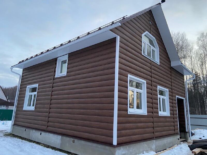 Металлический сайдинг "Бревно Рубленое 4Д" или "ЦАРЬСАЙДИНГ" в оттенке "Каштан" на фасаде дома в Москве