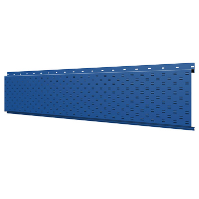 Линеарная потолочно-стеновая панель с ПЕРФОРАЦИЕЙ для вентиляции цвет RAL5005 Синий Сигнал применяется в качестве софитов для подшивы крыши, наружной и внутренней отделки потолков, стен, фронтонов фасада дома в Караганде.