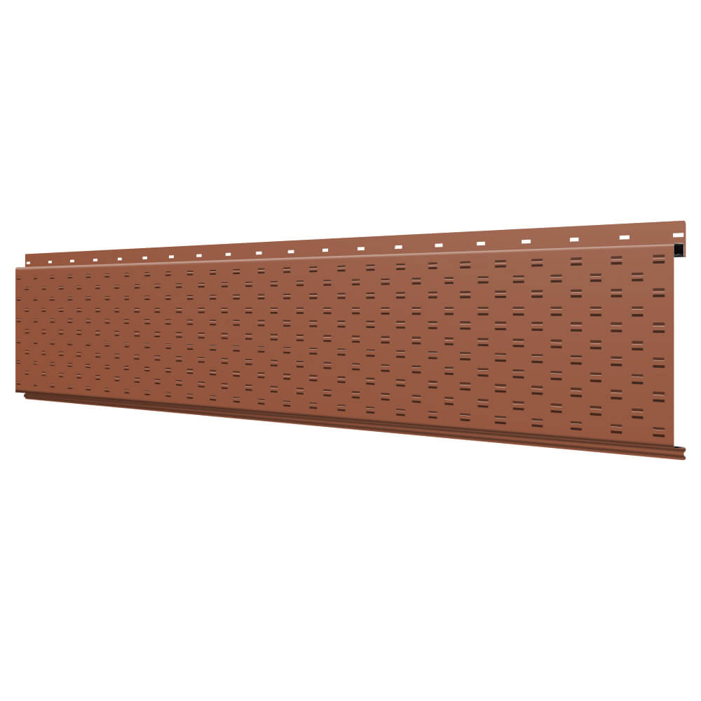 Линеарная потолочно-стеновая панель с ПЕРФОРАЦИЕЙ для вентиляции цвет RAL8004 Терракотовый применяется в качестве софитов для подшивы крыши, наружной и внутренней отделки потолков, стен, фронтонов фасада дома в Караганде.