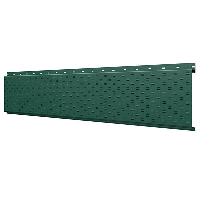 Линеарная потолочно-стеновая панель с ПЕРФОРАЦИЕЙ для вентиляции цвет RAL6005 Зеленый Мох Стальной Бархат применяется в качестве софитов для подшивы крыши, наружной и внутренней отделки потолков, стен, фронтонов фасада дома в Караганде.